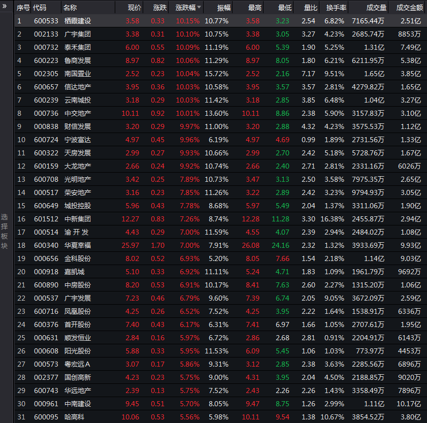 今天沪深两市,到收盘,多只地产股上涨。